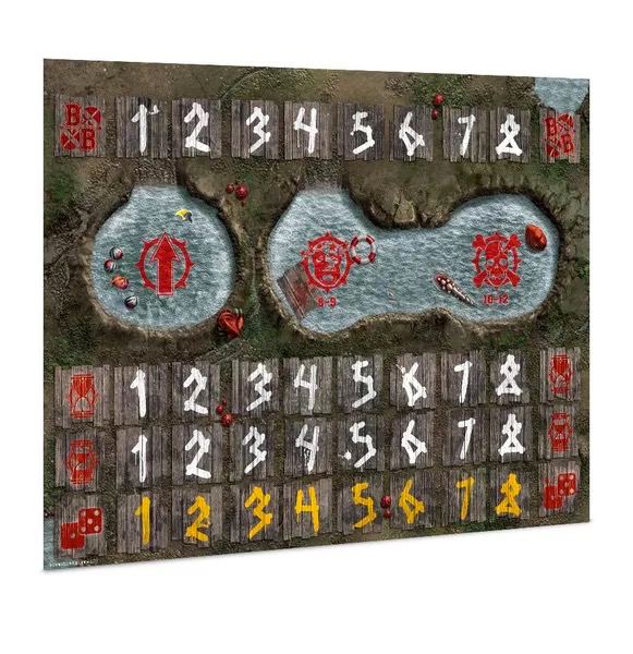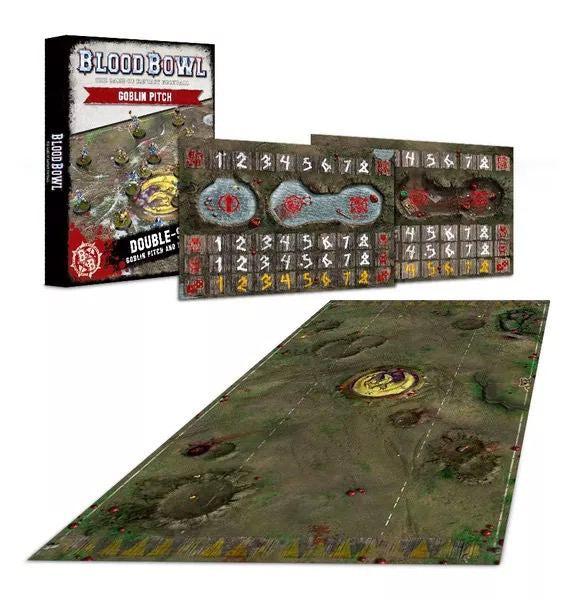 A double-sided card Blood Bowl pitch, complete with matching dug-outs, this is the perfect place for your Goblin teams to play. One side features a slightly worse for wear grass (and mud) pitch, covered in craters and debris – it’s even sprouting mushrooms. The other side is the same pitch after an extremely heavy rainfall – it’s completely waterlogged, and some unfortunate Goblins have drowned in the craters. The dug-outs are themed to match, and feature score trackers, reserves, Knocked Out and Serious Injury boxes, Down trackers for both halves, and a re-roll tracker.